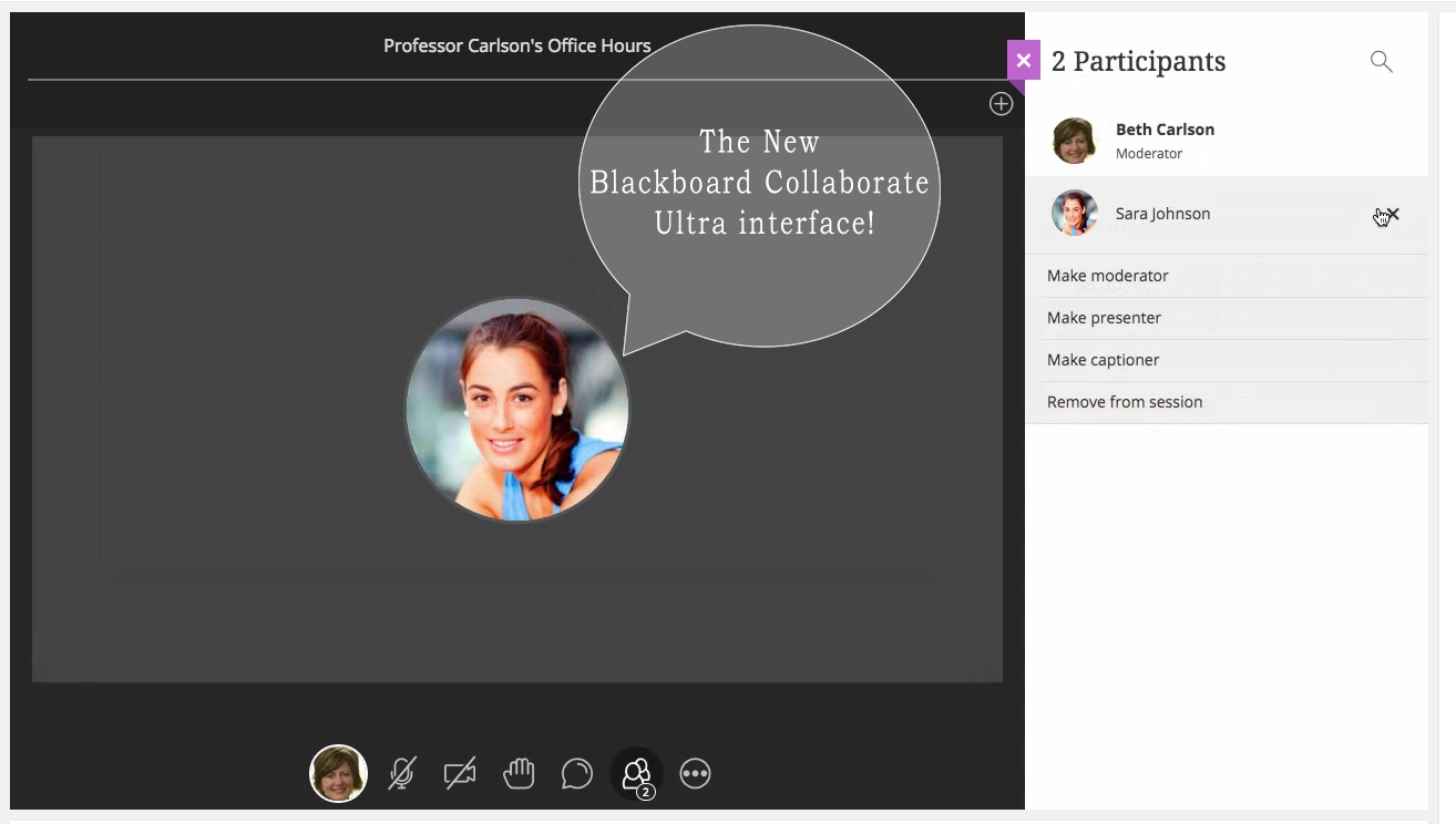 Blackboard’s release notes will tell you more about the < The Ultra Experience https://en-us.help.blackboard.com/Collaborate/Ultra/Moderator/030_Get_Started/Navigation > and < The Ultra Changes https://en-us.help.blackboard.com/Collaborate/Ultra/Administrator/030_Changes.