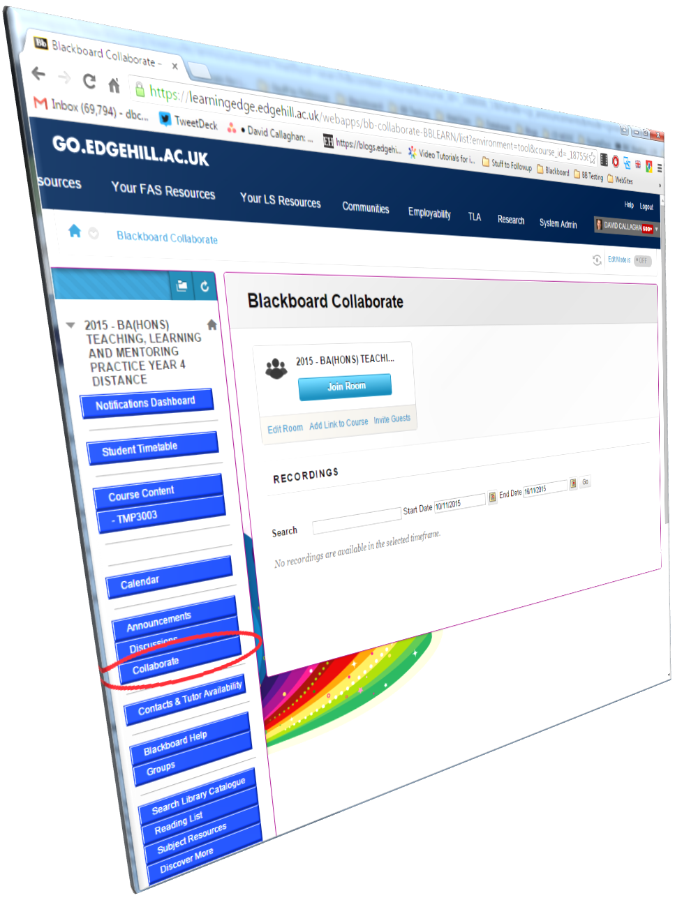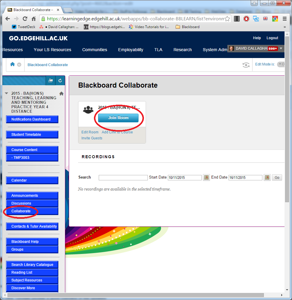 All 2015 courses have a link from their main menu to the Collaborate system – users simply need to click on the Collaborate button on the left, then Join Room buttons to launch the web conferencing system: