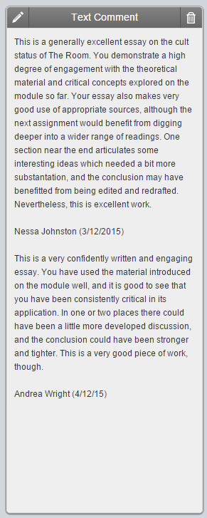 This summer, for the first time, Film Studies moved over to marking using Turnitin, and we decided that we wanted to make that marking as useful to the students as possible by indicating how they were scoring in relation to the grade criteria of 0-100, how well they were meeting the LOs and also by preserving some personal feedback that we have always used and been praised for by external examiners.