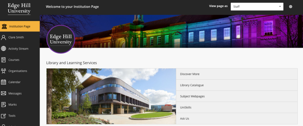 There is a new Institution Page, with links to selected university resources or services. This replaces the old tabs across the top of the page.
