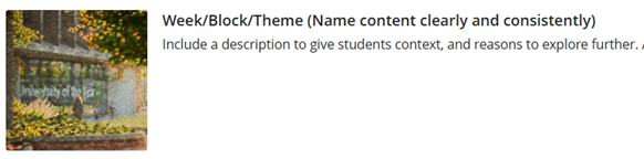 Use Learning Modules to clearly structure your content—be sure to label them and include short descriptions. Adding thumbnail images improves navigation and creates a more intuitive, student-friendly experience.