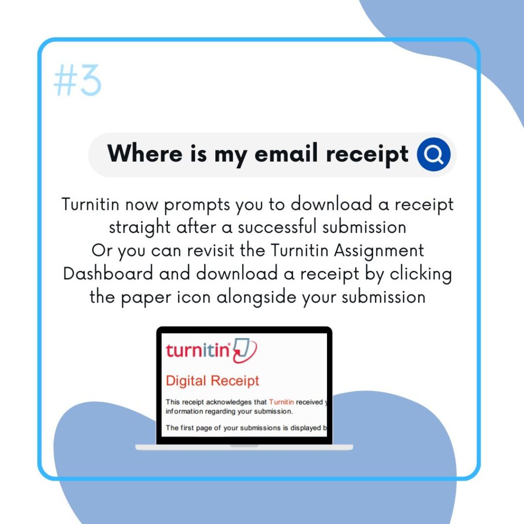 If you have used Turnitin prior to Summer 2022, you may have used an older version which would email your digital receipt to you. Turnitin now prompts you to download a receipt straight after a successful submission