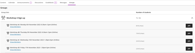 During the term a number of workshops are held, and students can pick a topic or session time they wish to attend. This was managed by creating self-signup groups where students add themselves to a group rather than being allocated.