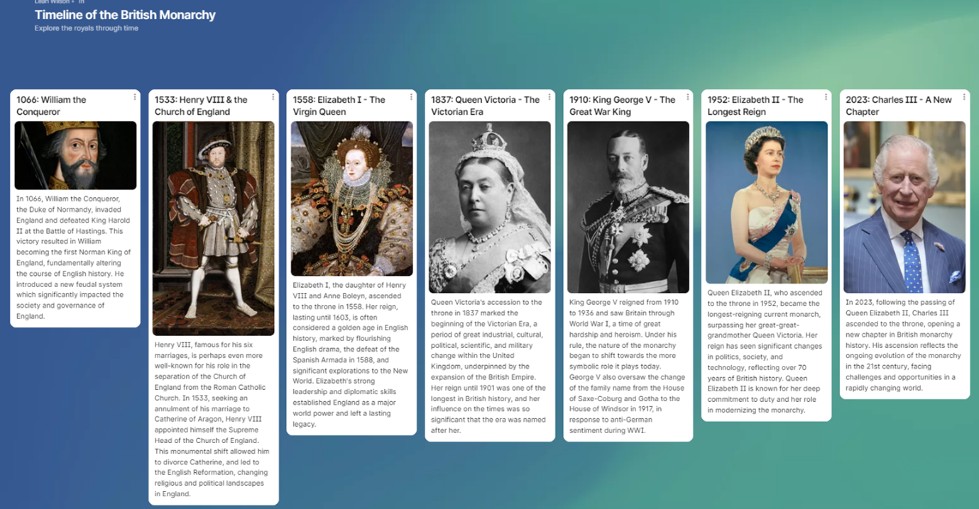 I had a play with this and selected ‘Timeline of events’ which shows a clear order of events. In the prompts I entered Timeline of British Monarchy, and this is what it generated!