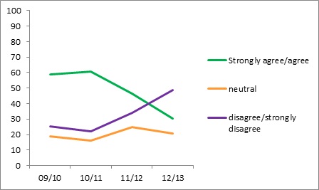 In the survey we ask students to respond to the statements On/off campus I sometimes have difficulties accessing Learning Edge and not surprisingly a lot of students agree or strongly agree. The responses to these statements are important measures of how well or otherwise the Learning Edge systems and student support are performing. They are also indicators of how effective Learning Services have been in identifying and resolving Learning Edge technical issues. So it is reassuring to note that since we started collecting data on this question and used the feedback to inform improvements, that the numbers of students experiencing technical difficulties have declined year on year.