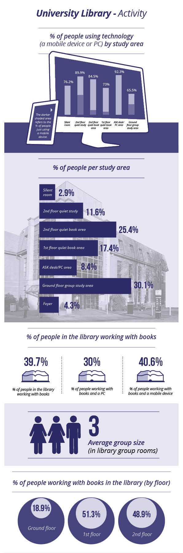 Well firstly we can see that you like to use technology in our learning spaces and that the ground floor social learning space is particularly popular.