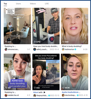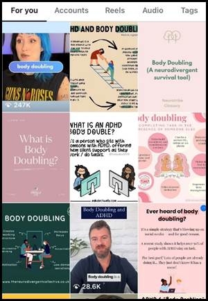 It is so popular as a strategy for people with ADHD that TikTok (#ADHDtok) has a whole category dedicated to content sharing hacks like this (#ADHDhacks #BodyDoubling). Instagram also offers many accounts to support body doubling, including options to join Instagram Live study with me sessions while you work or study.