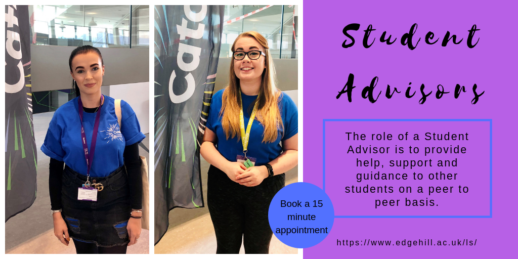 The Student Advisors are based in Catalyst and they are here to support you. The role of a Student Advisor is to provide help, support and guidance to other students on a peer to peer basis. The team are all current second, third year or Masters students and between them they bring a great variety of subject knowledge from their individual disciplines together with a wealth of experience from studying at Edge Hill, using all of that to support other students on their own University journey.